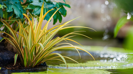 lakeside foliage plants, versicolor arundo donax, giant reed in summer, beautiful waterscape garden background greening