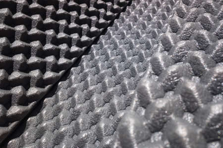Gray background of foam material with pyramidal protrusions on the surface used for vibration and noise insulation in recording studios or cars