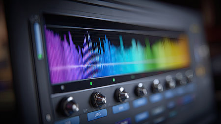 Audio waveform equalizer on monitor. Abstract technology concept. Computer generated image rendered with DOF