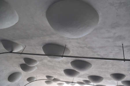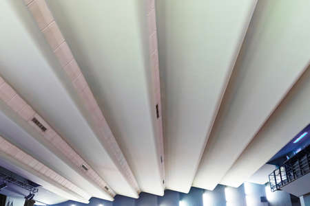 Clean geometric background with perspective of the ceiling of a modern theater interior with vanishing lines and curves, copy space for you designs.
