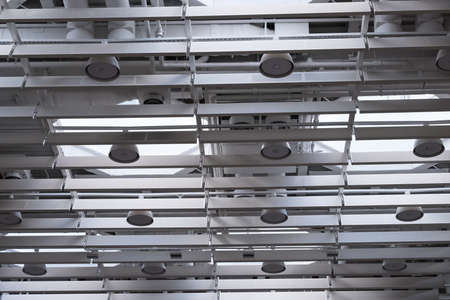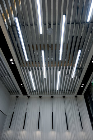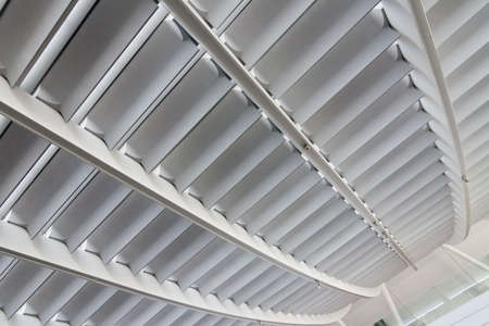 Hall or office ceiling design with rows of fluorescent lamps. Modern ceiling made of white metal slats and LED lighting.