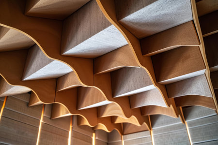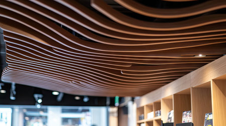 Modern design wooden ceiling with sound absorbing panels creating beautiful shapes
