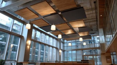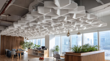 Closeup medium shot of specialized absorbing panels mounted in a modern office space designed to reduce ambient noise and improve speech clarity.