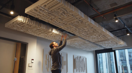 Medium shot of an acoustics expert adjusting soundproofing panels in a modern office to improve indoor noise control and employee comfort.