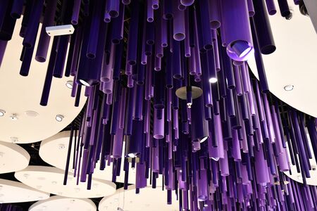 Two-colored purple and white abstract background of geometric shapes and lines. Creative lighting equipment on ceiling. Futuristic patterned backdrop with copy space.