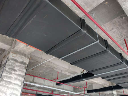 Ceiling insulation, ventilation system air ducts, fire extinguishing system pipes, electric cable channels under the ceiling of the Parking lot on the open ground floor of the building