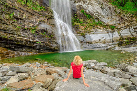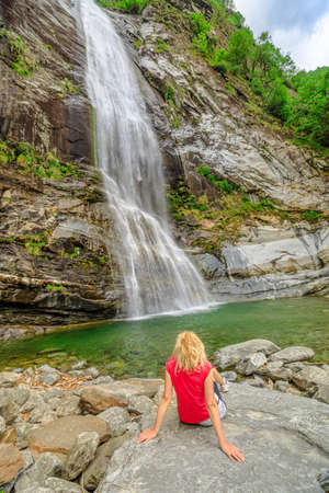 Woman sitting by the water of great waterfall of Bignasco, Valle Maggia, intersection point between the Bavona valley and Lavizzara valley, Cevio in Switzerland.