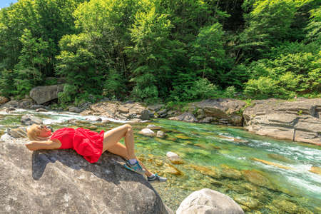 Woman relaxing sitting on the rocks of the Verzasca river. Verzasca valley by Lavertezzo town. Famous landmark for riverside leisure and high diving in Ticino, Switzerland.