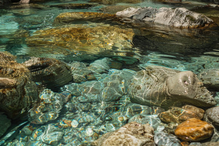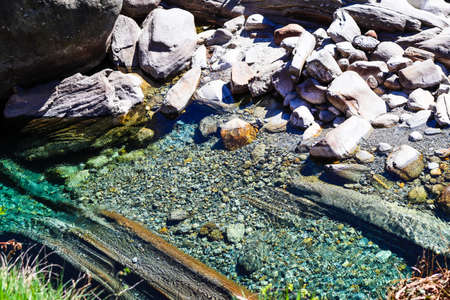 Stones and Rocks in the blue water of the Bavona River flowing through the Valley in the Ticino in Switzerland