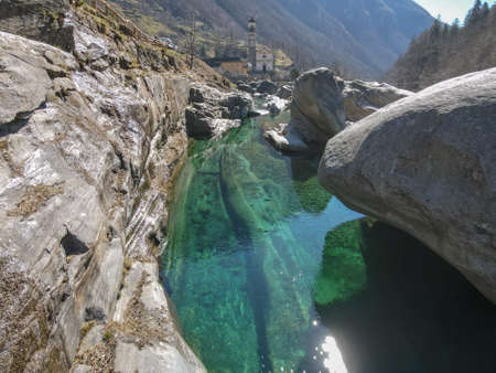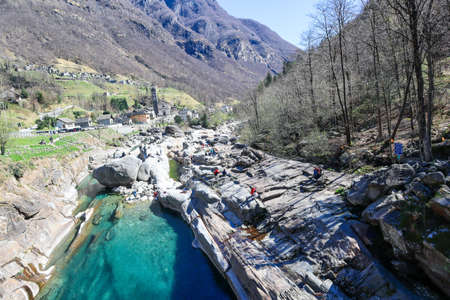 Tourquise clear Verzasca River in Lavertezzo, Ticino, Switzerland