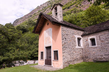 Church at Santa Petronilla waterfalls in Biasca, Cantone Ticino, Switzerland