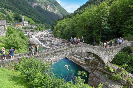 Lavertezzo, Switzerland - 9 June 2018: man jumping into the river Versasca at Lavertezzo on the Swiss alps
