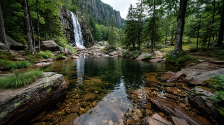 Serene waterfall cascading over rocks into a calm pool.