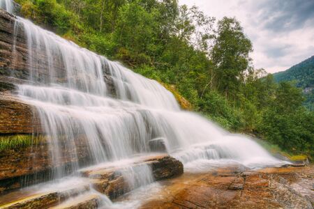 Waterfall stream in summer green forest landscape