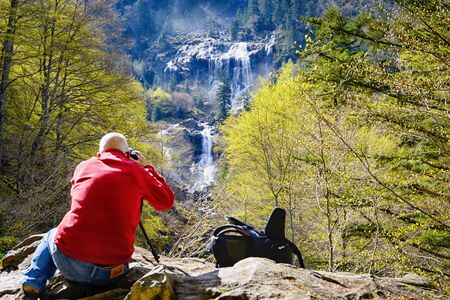 a man photograph a waterfall in the mountains