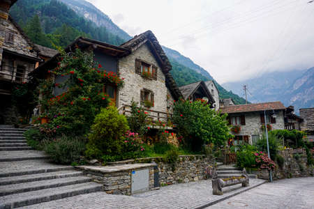 The street of Alpine village with colorful and stone grey houses, Sonogno, Valle Verzasca, Switzerland