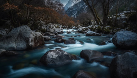Majestic mountain peak, flowing water, tranquil scene, smooth rock generated by artificial intelligence