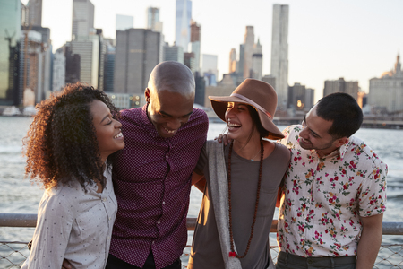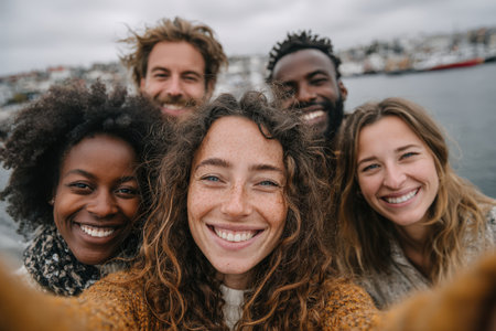 Diverse group of friends enjoying a moment together, smiling brightly while taking a selfie outdoors by the water, capturing the essence of friendship and joy