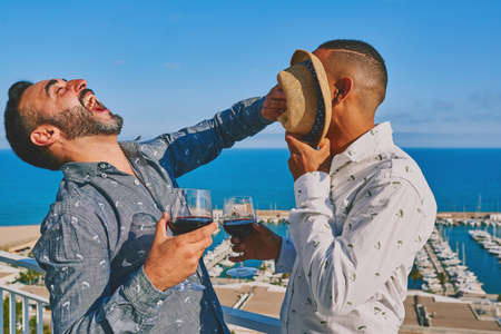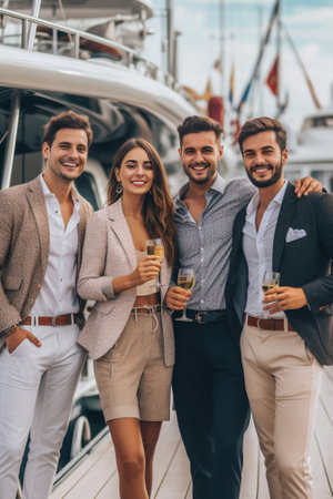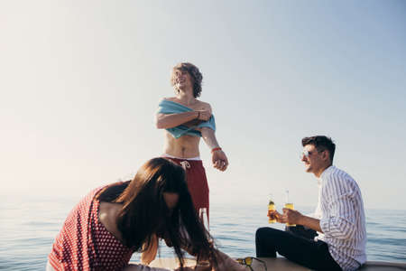 friends making boat party having fun drinking beers and laughing together in sail sea