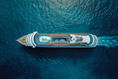 Miami, Florida, USA - June 07, 2024: Cruise ship vacation. Aerial view of cruise ship in vacation summer. Travel at sea. Luxury liner. Ship leaving port