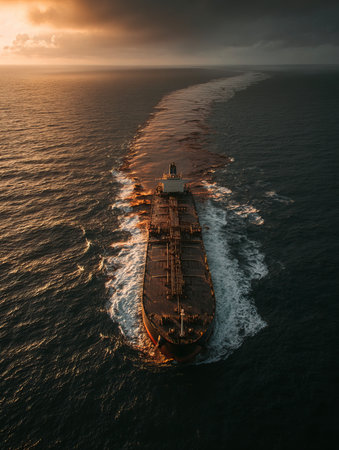 Aerial shot of an expansive oil transport ship with a symmetrical deck layout, surrounded by gentle ocean ripples. The tranquil scene features minimal sky gradient and crisp industrial details.