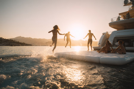Group of people engage in water-based activities near a large yacht at sunset. The scene features figures silhouetted against the bright sun, with water droplets creating a dynamic composition. The image has a warm color palette, potentially suitable for promotional or lifestyle content.