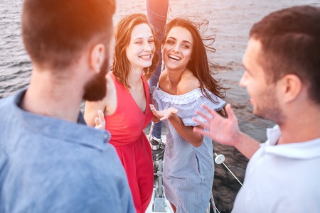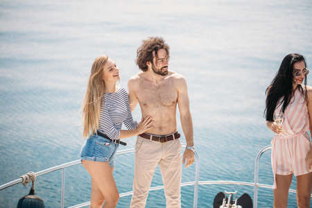 Luxury vacation. Joyful young male and female friends dancing and having fun on a bow of sailing boat deck, smiling, hugging over amazing blue marine background. Banner.
