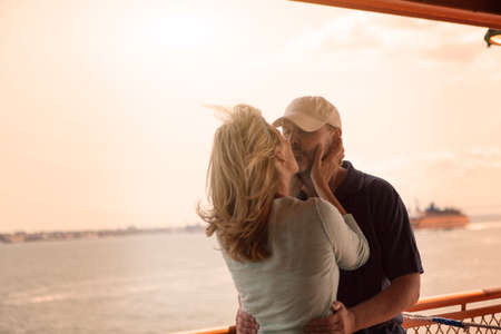 Young couple in love drinking coffee on a boat and enjoying the sea