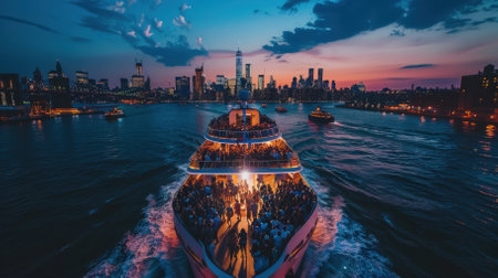A ferry boat gliding across calm waters, with passengers enjoying the view from the deck.. --ar 16:7 --v 6.1 Job ID: 5576016b-7efd-4ed7-9539-652556d18a82