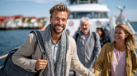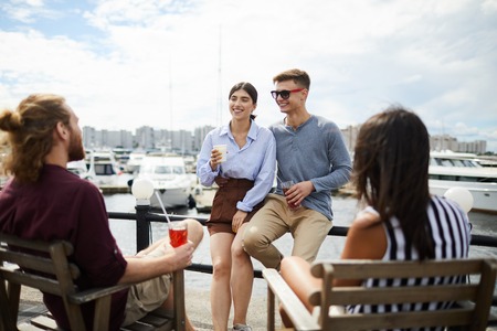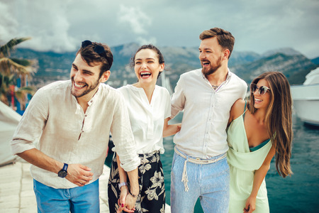 Friends walking by the harbor of a touristic sea resort with boats on background