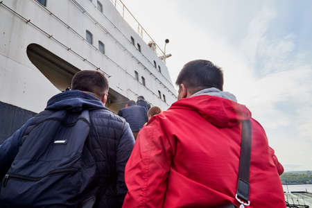 Murmansk, Russia - June 21, 2019: Group of people during an excursion to the ship historical Museum. The first nuclear powered icebreaker Lenin in Murmansk in Russia
