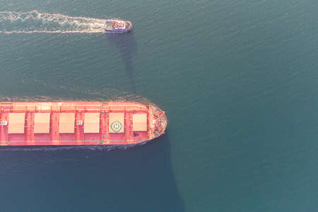 Aerial view of tug boat assisting big cargo ship. Large cargo ship enters the port escorted by tugboats.