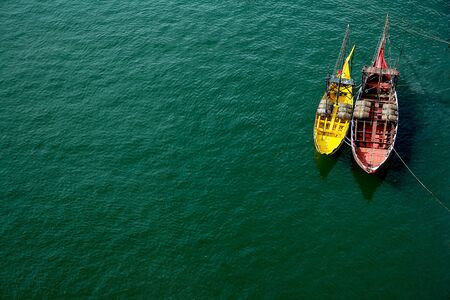 A view from above on two boats, red and yellow which are located on the blue water, the river. Porto, Portugal.