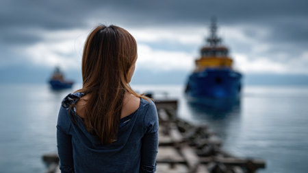 A woman stands on a pier looking out at the water. The sky is cloudy and the water is calm