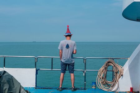 Surat Thai, Thailand - January 24, 2018: Tourists traveling on a ferry to the Koh Samui and Koh Phangan islands. Man standing on the deck