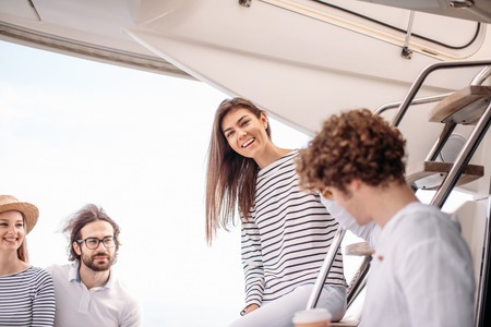Travel, seatrip, friendship and people concept - friends sitting on yacht deck