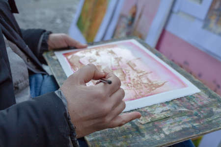 Closeup of watercolor painting process. Brush in hand above painting. Colorful medieval city street on paper board.