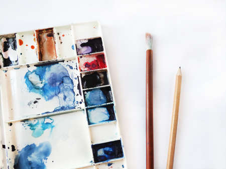 art painting leisure craft and hobby. drawing and creativity concept. watercolor palette and brushes. artist instruments and tools.