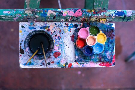 Close-up Paint on a drawing board in the house to create art with watercolors and brushes.