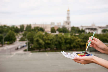 Hands of artist holding brush with watercolor painting