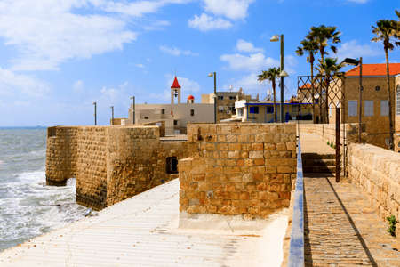 A fragment of the city wall and promenade in the city of Acre in Israel