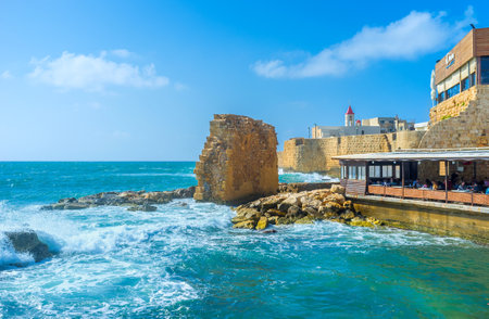 View of the beach promenade and the old port in Caesarea National Park, Northern Israel