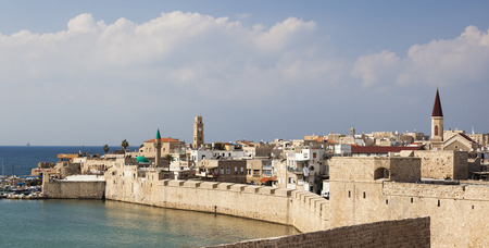 ACRE, ISRAEL - MARCH 23, 2018: View of the old city of Acre, with the clock tower, minarets and mosque