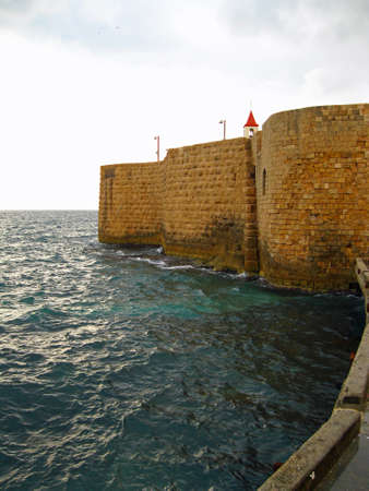 Sea and casle wall at city of Acre in Western Galilee, Israel