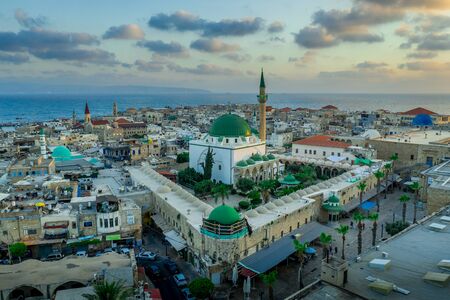 Aerial summer sunset view of Acco, Acre, Akko medieval old city with green roof Al Jazzar mosque and crusader palace in Israel