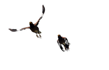 Closeup Two Mynah Bird Flying and Jumping in The Air Isolated on White Background with Clipping Path and Copy Space