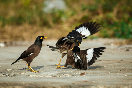 A selective focus shot of the Common Mynas fighting with each other on the lawn