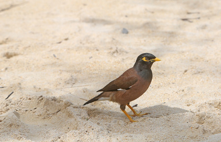 Common Myna bird in the forest near tropical beach. Copy space. Travel and nature concept
