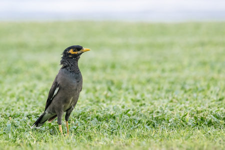 Tropical noisy bird Common myna with black and brown plumage and yellow eyes and legs is walking on the lawn with green grass.