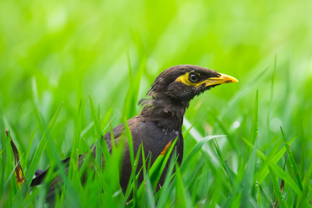 A black bird with a yellow beak (Acridotheres tristis) on a green background.